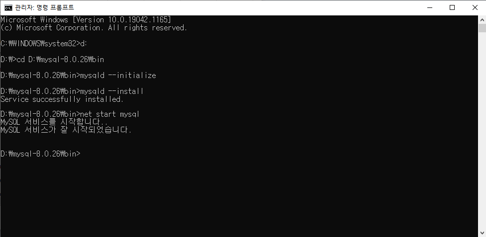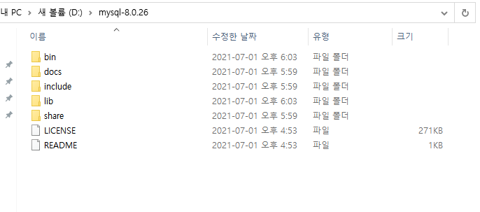 2. 압축풀기 : 원하는 위치에 압축파일을 푼다. (예시 : D:\mysql-8.0.26)