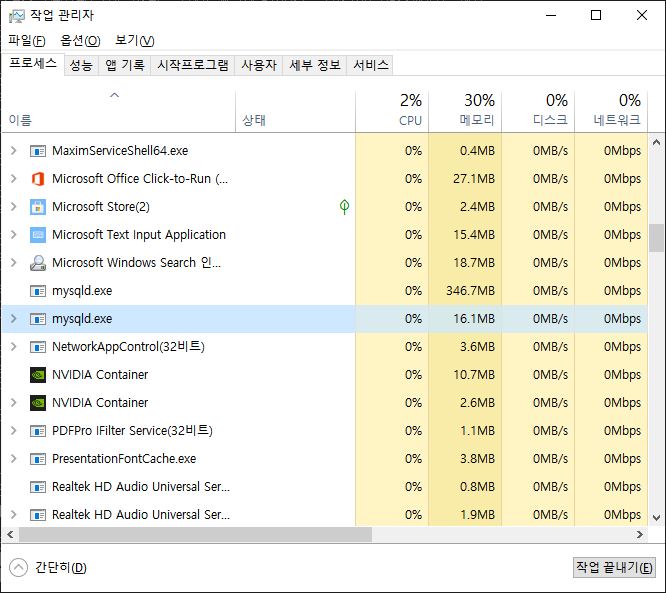 9. mysql 서비스 확인 : 작업 관리자에서 프로세스에 mysqld.exe 실행되고 있는지 확인