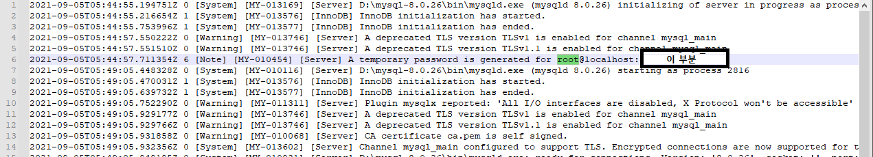 5. 초기 암호 확인 : D:\mysql-8.0.26\data 에 DESKTOP-RJ0MP3U.err 열어 "root" 라고 검색 후
