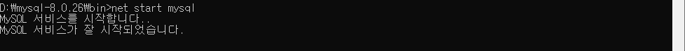 서비스 실행 : net start mysql (서버 컴퓨터를 재부팅 할 일이 있을지 모르나 시작시 자동으로 실행되게 하기도 함.)
