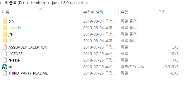 - 필자는 D:\tomtom\java-1.8.0-openjdk 에 풀음.