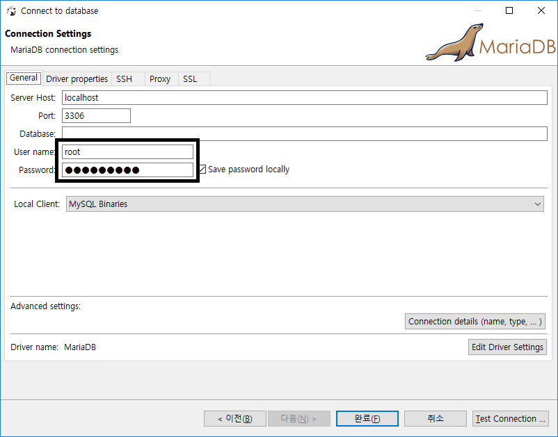 - 아까 설정했던 root의 암호 입력