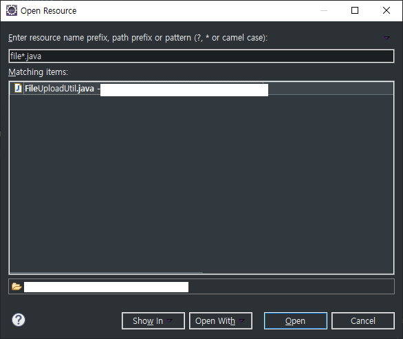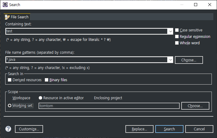 - File name patterns : 주로 *.확장자 로 검색, 여기서 "*"은 전체를 의미( ex : *.xml, *.java, *.*)