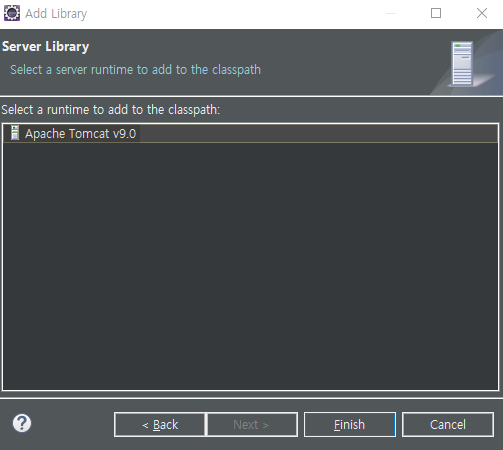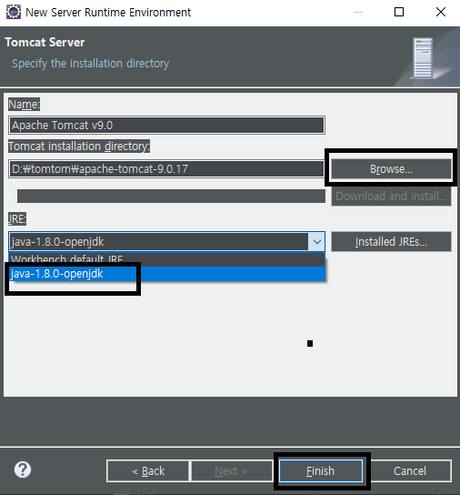 - 서버의 위치 지정 후 JRE를 본인의 jdk로 지정 후 finish