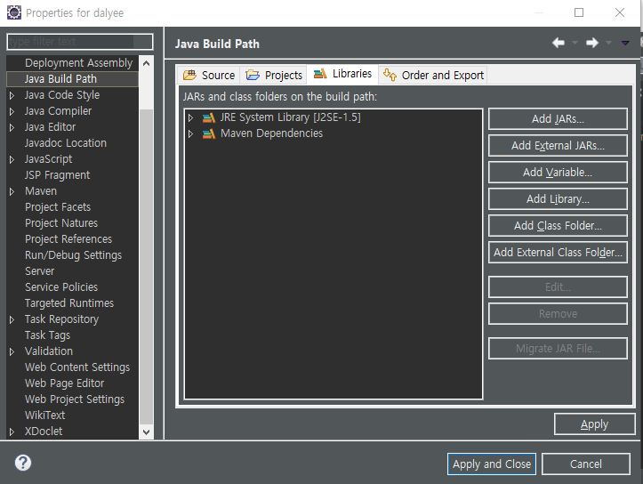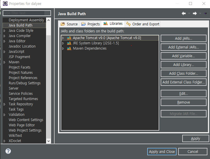 - 경로 : 프로젝트 오른쪽 클릭 > properties > Java Build Path > Libraries > Add Library