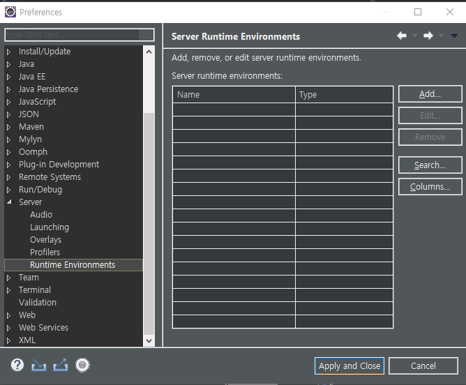 - 경로 : window > preferences > Server > Runtime Environments > Add